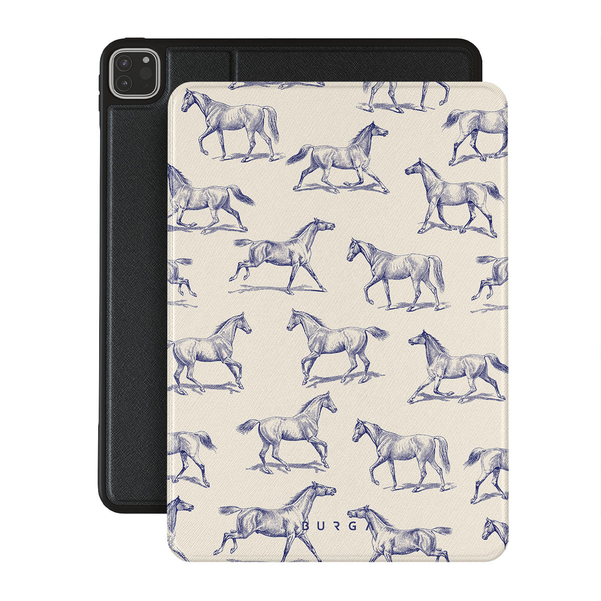 Introducing our Derby Race iPad Pro 12.9 (6th/5th Gen) folio case designa portrait of elegance in motion on a soft nude canvas. Engraved in delicate blue contours, galloping horses dance upon the wind, frozen in an exquisite moment of grace.