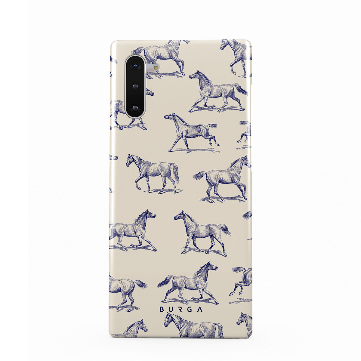 Introducing our Derby Race Samsung Galaxy Note 10 phone case designa portrait of elegance in motion on a soft nude canvas. Engraved in delicate blue contours, galloping horses dance upon the wind, frozen in an exquisite moment of grace.