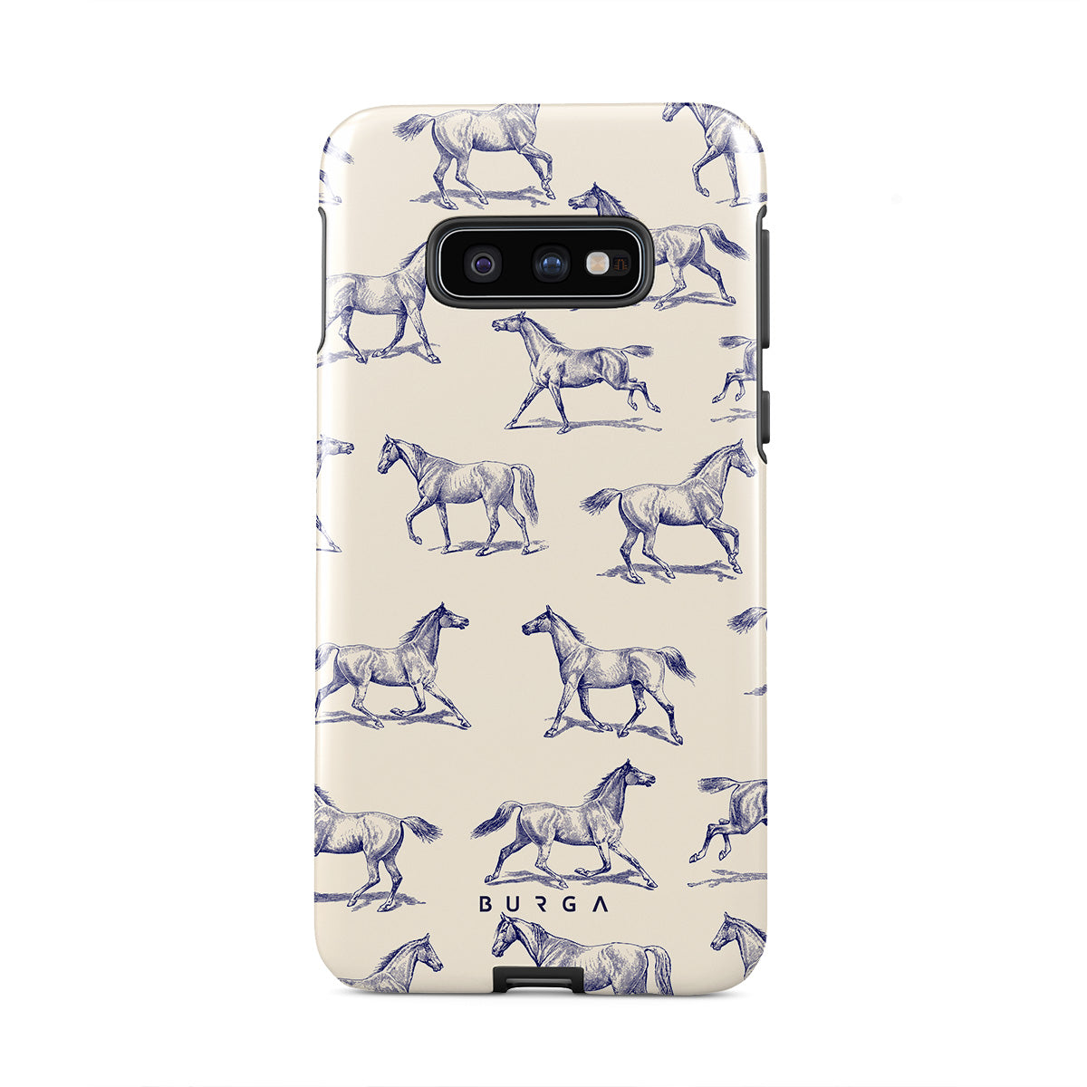Introducing our Derby Race Samsung Galaxy S10E phone case designa portrait of elegance in motion on a soft nude canvas. Engraved in delicate blue contours, galloping horses dance upon the wind, frozen in an exquisite moment of grace.