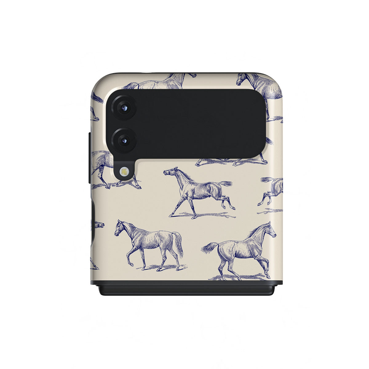 Introducing our Derby Race Samsung Galaxy Z Flip 3 phone case designa portrait of elegance in motion on a soft nude canvas. Engraved in delicate blue contours, galloping horses dance upon the wind, frozen in an exquisite moment of grace.