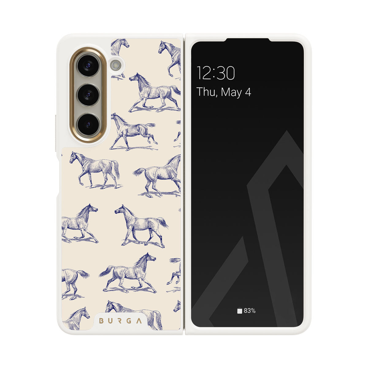 Introducing our Derby Race Samsung Galaxy Z Fold 5 phone case design—a portrait of elegance in motion on a soft nude canvas. Engraved in delicate blue contours, galloping horses dance upon the wind, frozen in an exquisite moment of grace.