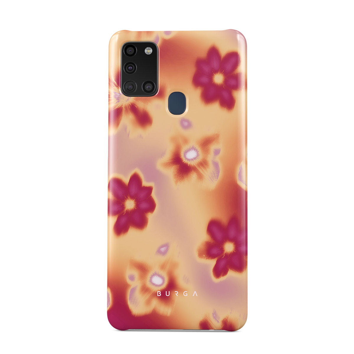 Get lost in the allure of our Divine Samsung Galaxy A21s 4G phone case design. Picture blossoms bathed in fiery hues of pink and orange, each seemingly charged with life's raw energy. Set against a canvas that radiates power and warmth, these flowers offer more than just beauty; they resonate with the essence that binds us all.