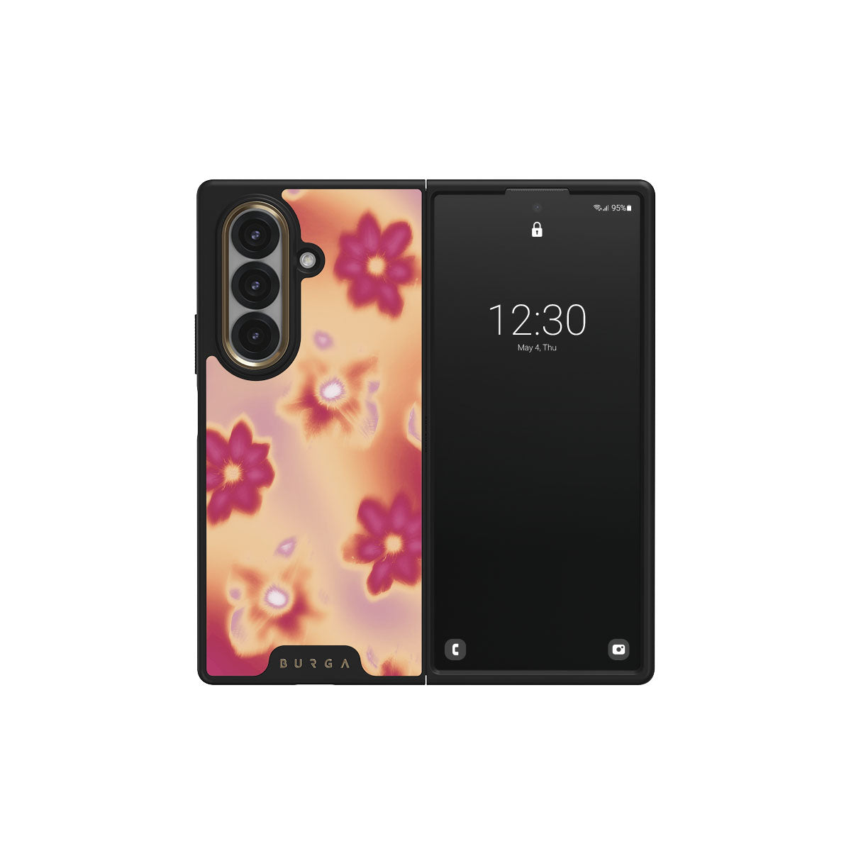 Get lost in the allure of our Divine Samsung Galaxy Z Fold 7 phone case design. Picture blossoms bathed in fiery hues of pink and orange, each seemingly charged with life's raw energy. Set against a canvas that radiates power and warmth, these flowers offer more than just beauty; they resonate with the essence that binds us all.