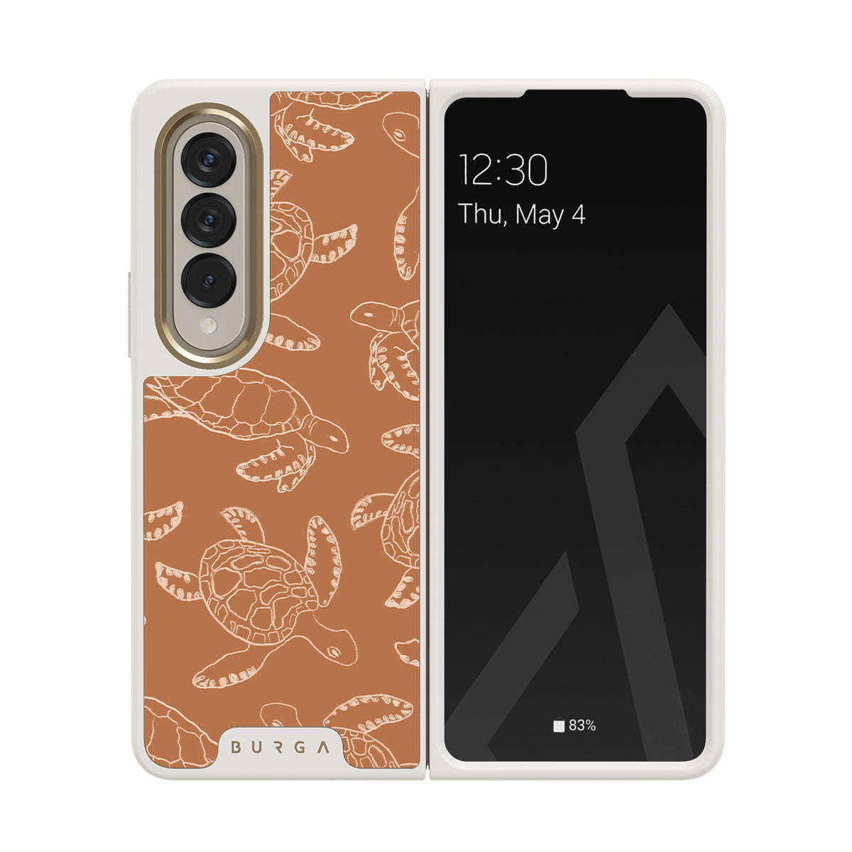 Step into a world of pure bliss and turtle magic with our Earth Shell design. The rich earth tones creating a calming ambiance blend beautifully with the playful turtles floating into adventure. Embark on a thrilling escapade to reconnect with nature with our Earth Shell Samsung Galaxy Z Fold 4 case.