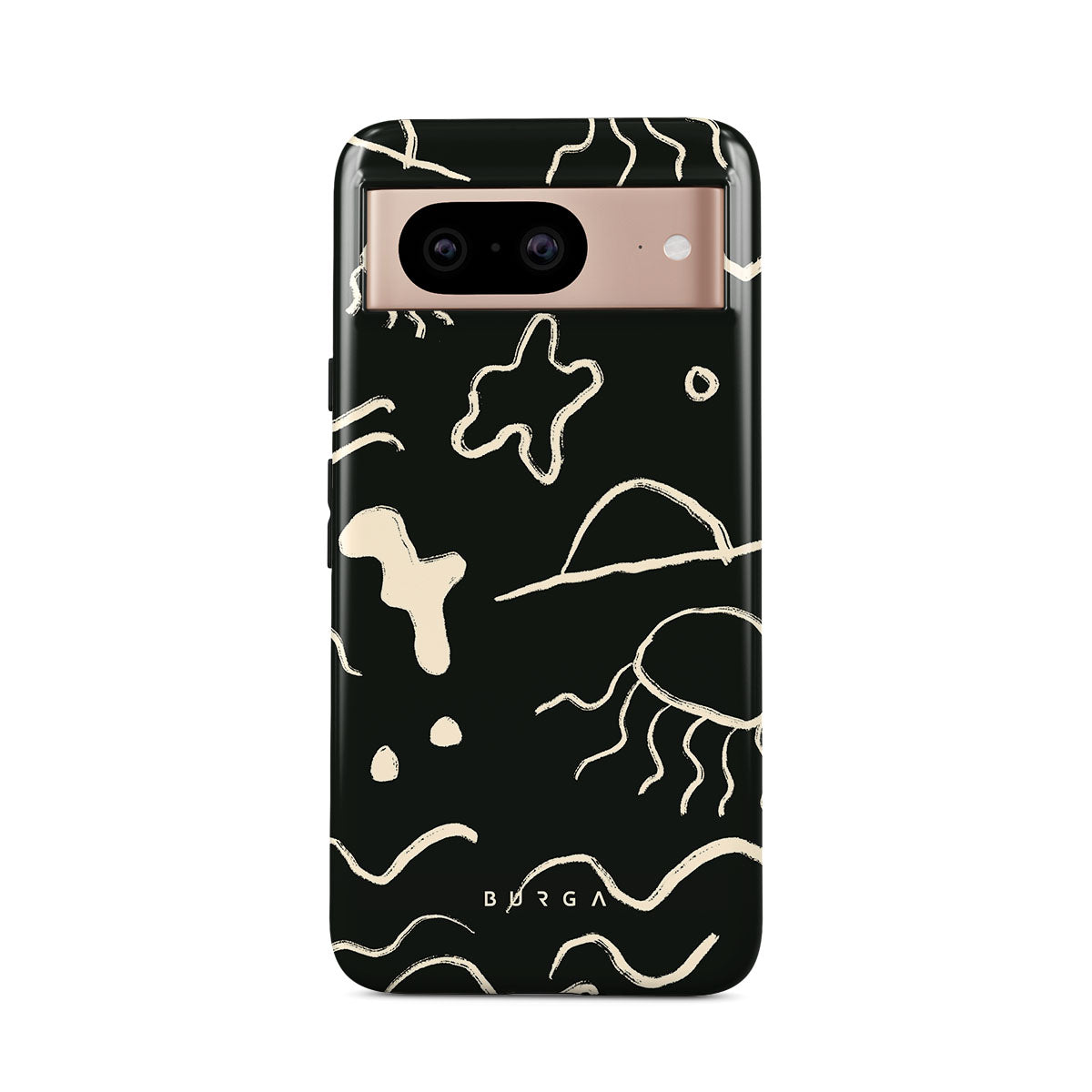 Our Eclipse Google Pixel 8 design reflects the enigmatic beauty of the ocean during a solar eclipse. The dark hues and bright accents represent how the light dances on the water, while the waves and jellyfish capture the serene yet dynamic nature of the ocean.