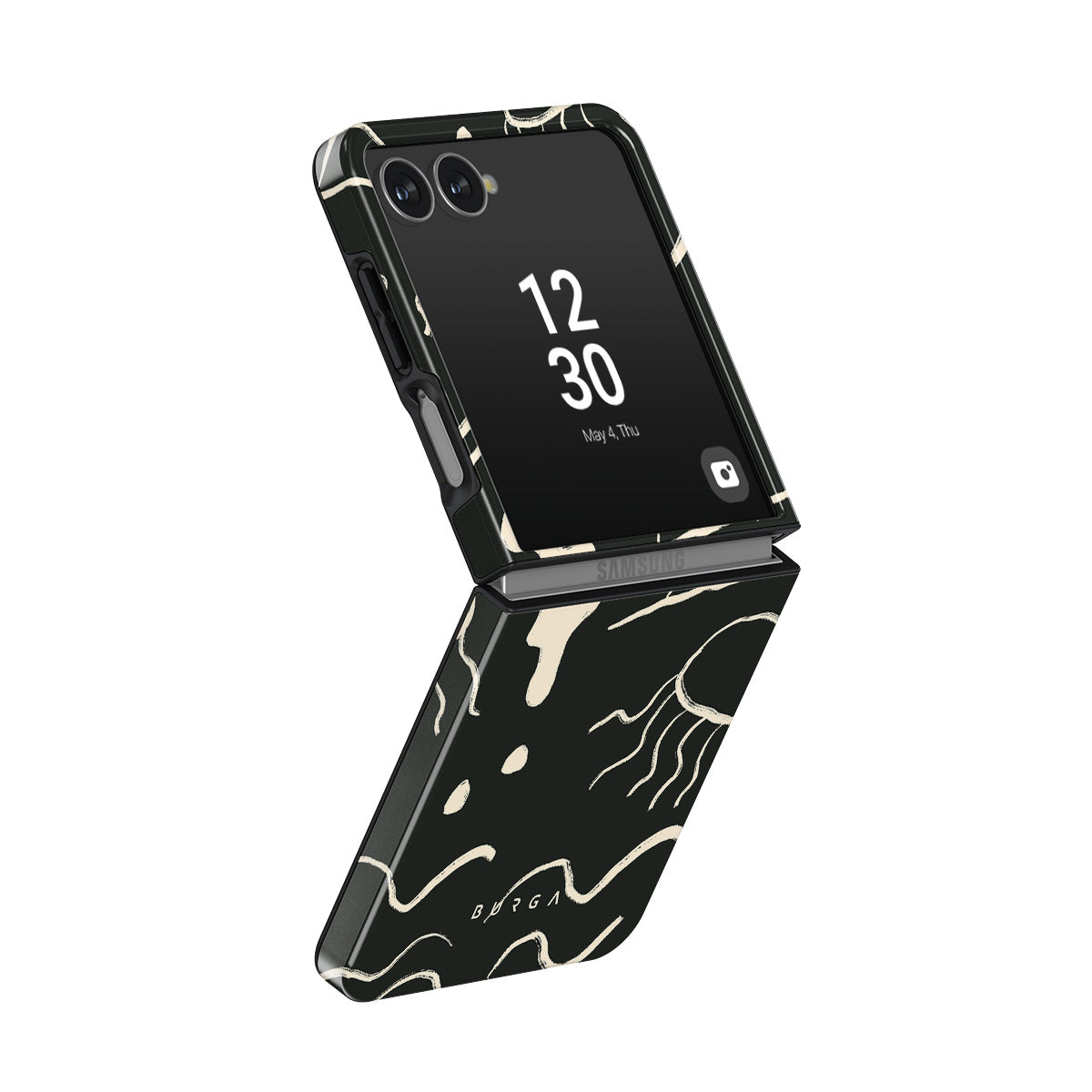 Our Eclipse Samsung Galaxy Z Flip 7 design reflects the enigmatic beauty of the ocean during a solar eclipse. The dark hues and bright accents represent how the light dances on the water, while the waves and jellyfish capture the serene yet dynamic nature of the ocean.