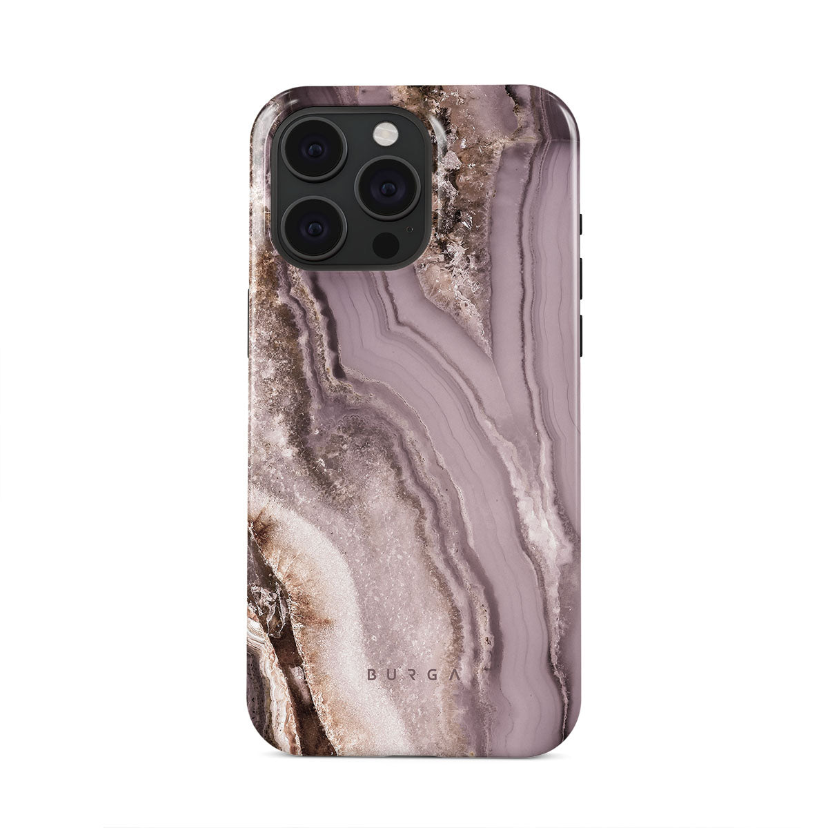 Make a fashion statement with iPhone 15 Pro phone case that reminds of a geode in the softest mauve shade. A phone case that is both pretty and protective is a best friend of a fashion lover.