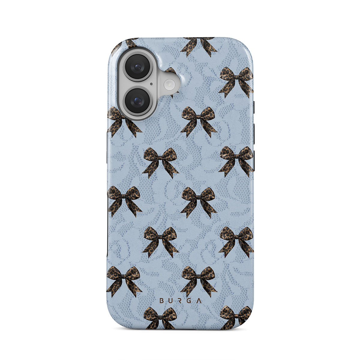 For those who command attention with subtle elegance, our Fashionista iPhone 16 Plus phone case design is your go-to. A soft blue background, accented by dark grey bows and subtle lace patterns, exudes polished, effortless style. It's quiet confidence with a hint of charm.
