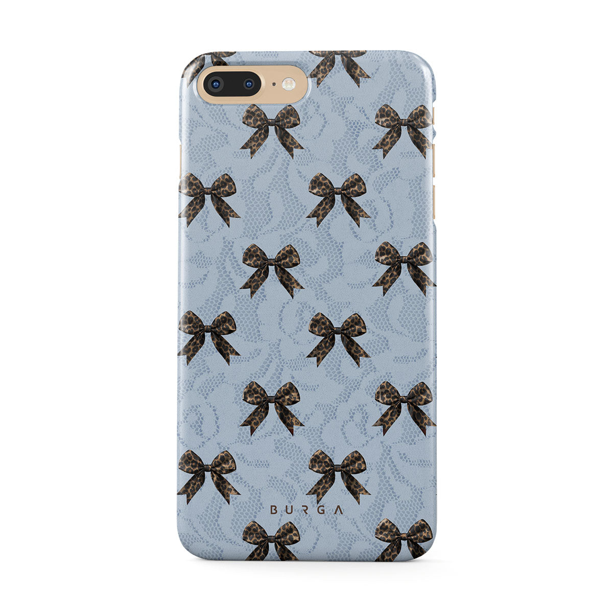 For those who command attention with subtle elegance, our Fashionista iPhone 7 Plus / 8 Plus phone case design is your go-to. A soft blue background, accented by dark grey bows and subtle lace patterns, exudes polished, effortless style. It's quiet confidence with a hint of charm.