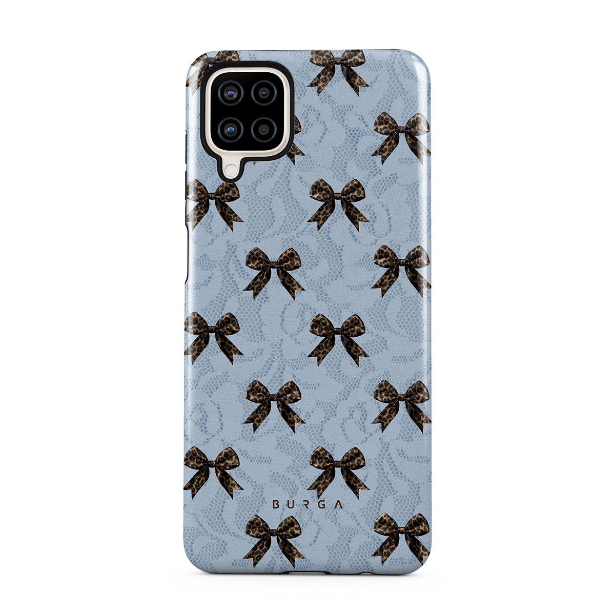 For those who command attention with subtle elegance, our Fashionista Samsung Galaxy A12 4G phone case design is your go-to. A soft blue background, accented by dark grey bows and subtle lace patterns, exudes polished, effortless style. It's quiet confidence with a hint of charm.