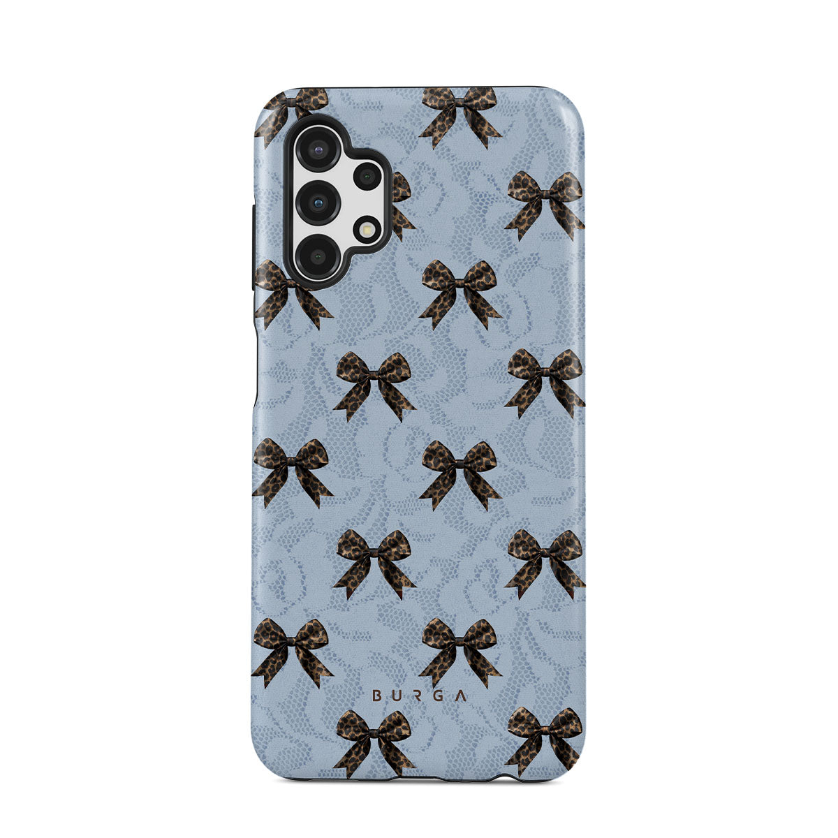 For those who command attention with subtle elegance, our Fashionista Samsung Galaxy A13 4G phone case design is your go-to. A soft blue background, accented by dark grey bows and subtle lace patterns, exudes polished, effortless style. It's quiet confidence with a hint of charm.