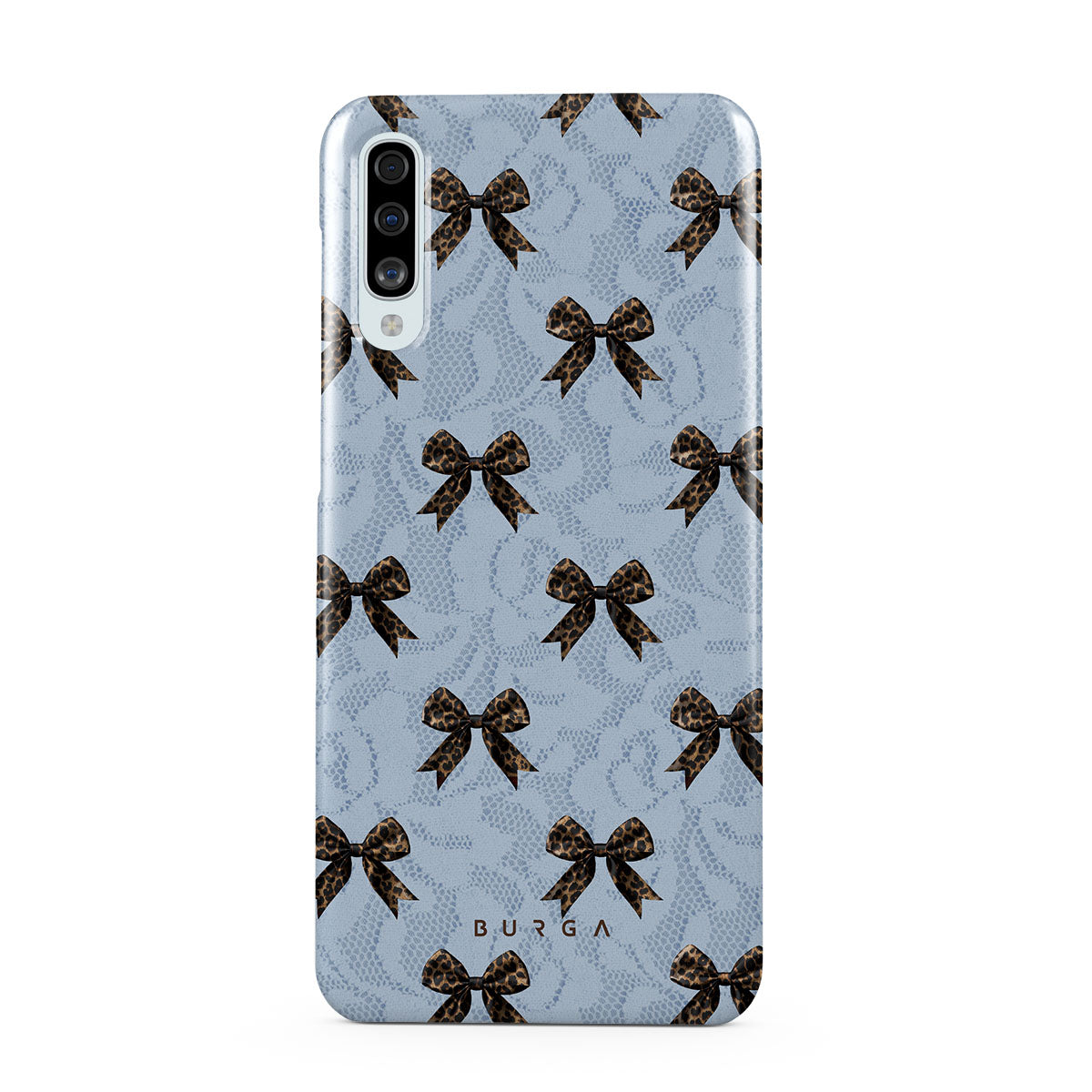 For those who command attention with subtle elegance, our Fashionista Samsung Galaxy A50 phone case design is your go-to. A soft blue background, accented by dark grey bows and subtle lace patterns, exudes polished, effortless style. It's quiet confidence with a hint of charm.