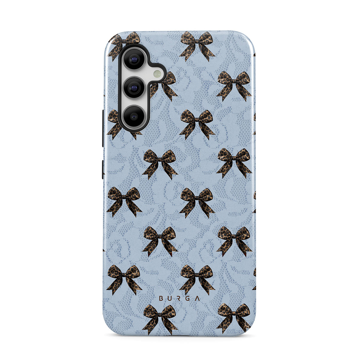 For those who command attention with subtle elegance, our Fashionista Samsung Galaxy A55 phone case design is your go-to. A soft blue background, accented by dark grey bows and subtle lace patterns, exudes polished, effortless style. It's quiet confidence with a hint of charm.