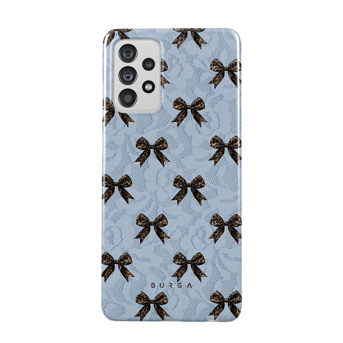 For those who command attention with subtle elegance, our Fashionista Samsung Galaxy A72 4G / 5G phone case design is your go-to. A soft blue background, accented by dark grey bows and subtle lace patterns, exudes polished, effortless style. It's quiet confidence with a hint of charm.