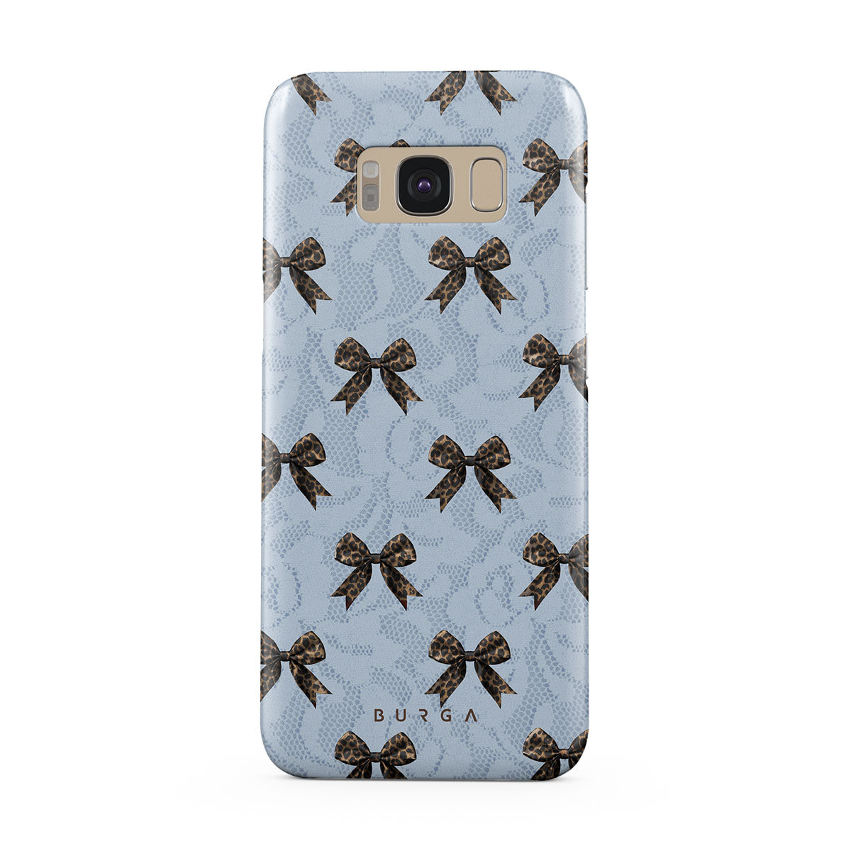 For those who command attention with subtle elegance, our Fashionista Samsung Galaxy S8 phone case design is your go-to. A soft blue background, accented by dark grey bows and subtle lace patterns, exudes polished, effortless style. It's quiet confidence with a hint of charm.