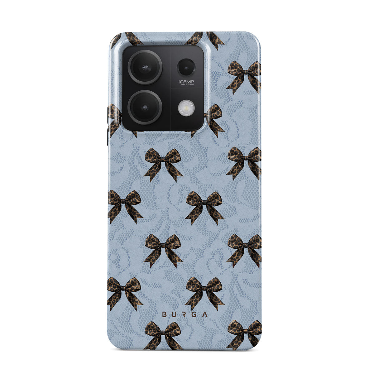 For those who command attention with subtle elegance, our Fashionista Xiaomi Redmi Note 13 5G phone case design is your go-to. A soft blue background, accented by dark grey bows and subtle lace patterns, exudes polished, effortless style. It's quiet confidence with a hint of charm.
