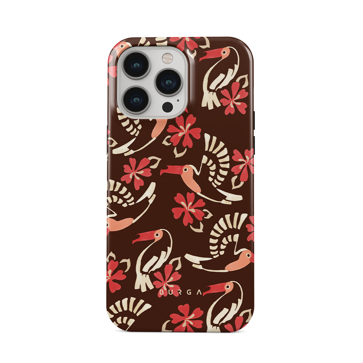 A jungle rave. Parrots, florals, bursts of red and cream—like someone threw a party in the rainforest and forgot to send you the invite. This iPhone 14 Pro phone case design is your RSVP.