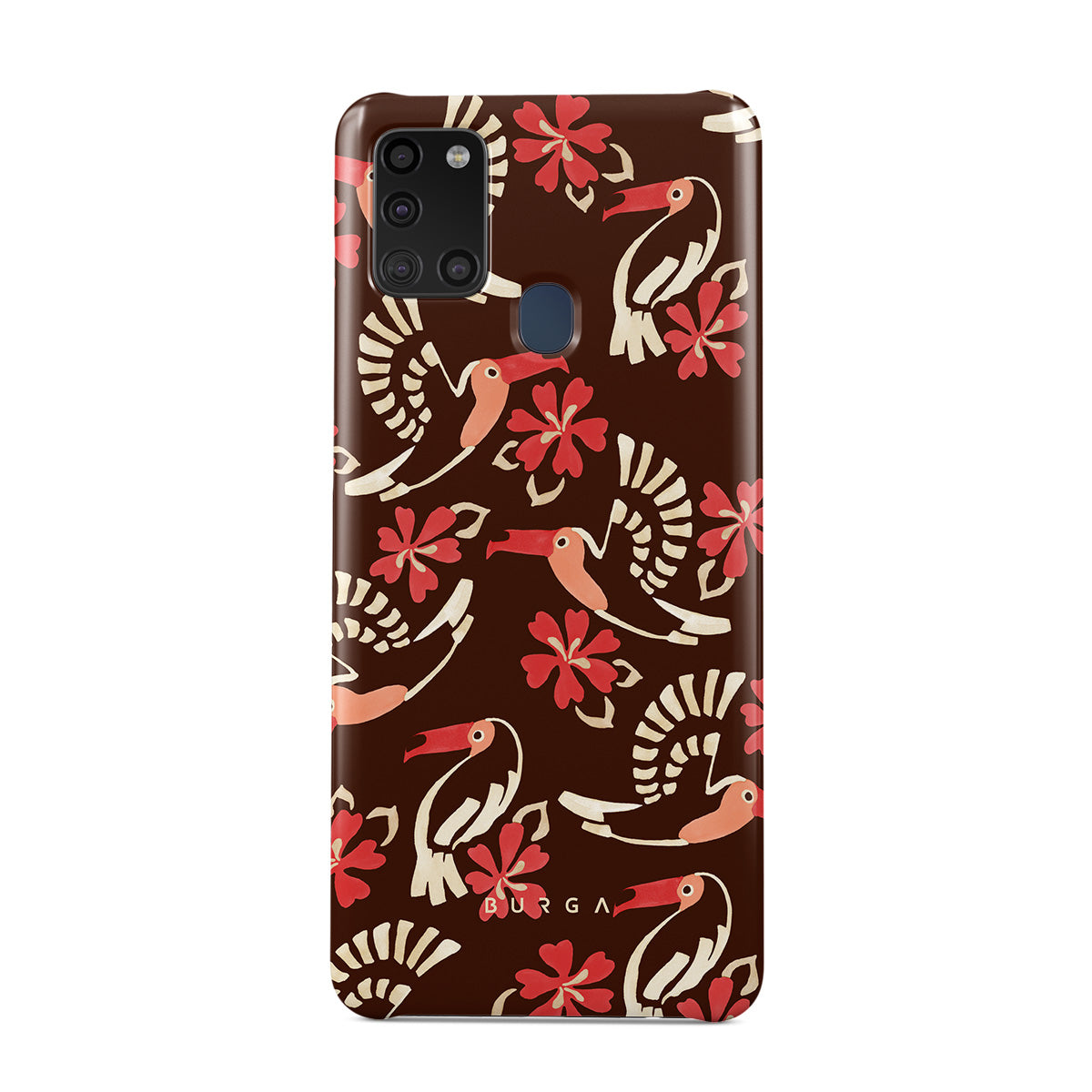 A jungle rave. Parrots, florals, bursts of red and cream—like someone threw a party in the rainforest and forgot to send you the invite. This Samsung Galaxy A21s 4G phone case design is your RSVP.