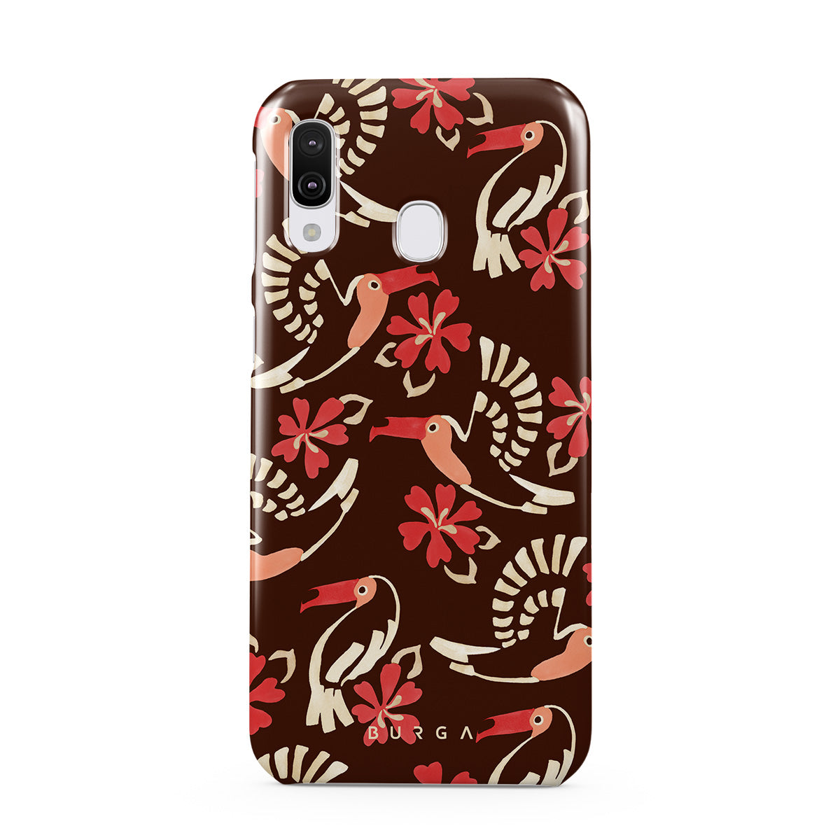 A jungle rave. Parrots, florals, bursts of red and cream—like someone threw a party in the rainforest and forgot to send you the invite. This Samsung Galaxy A40 phone case design is your RSVP.