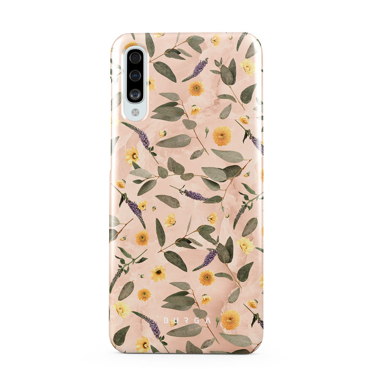 Sunday Brunch Samsung Galaxy A50 phone case features a timeless flower pattern. The soft-toned case with a pop of lavender and yellow colors will add a splash of energy to your style while protecting your phone from dangerous falls.