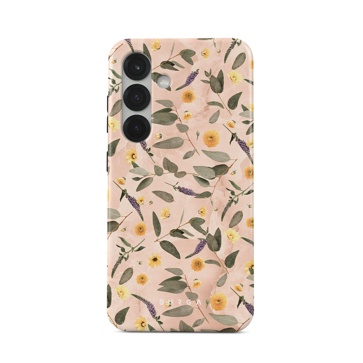 Sunday Brunch Samsung Galaxy S25 Plus phone case features a timeless flower pattern. The soft-toned case with a pop of lavender and yellow colors will add a splash of energy to your style while protecting your phone from dangerous falls.