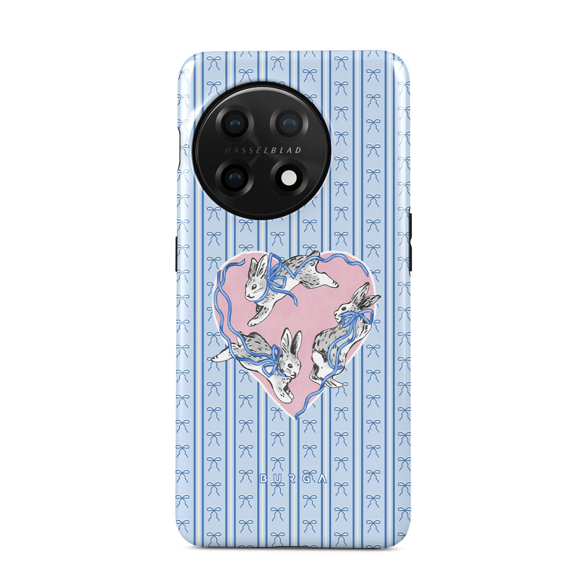 This design features: white rabbits, heart frame, blue stripes