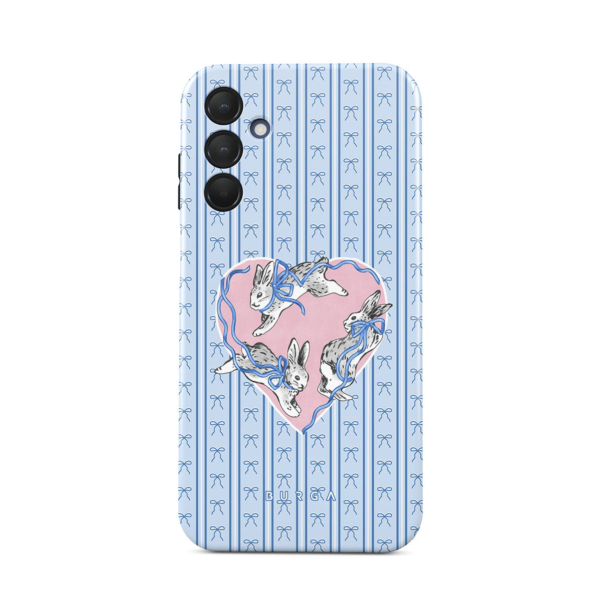 This design features: white rabbits, heart frame, blue stripes