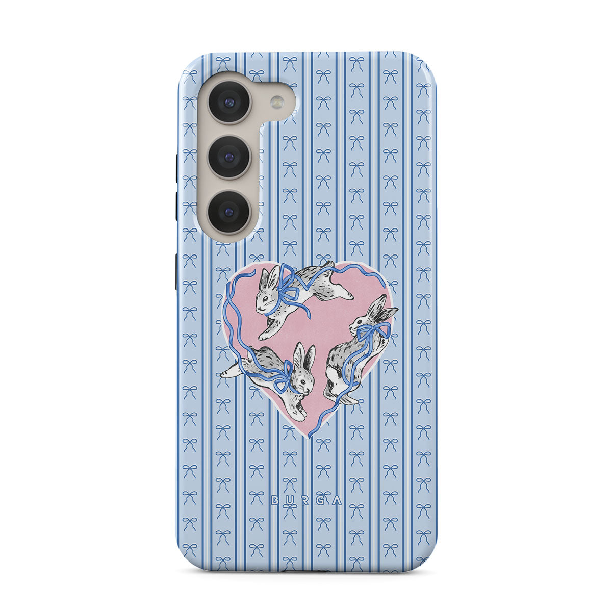 This design features: white rabbits, heart frame, blue stripes