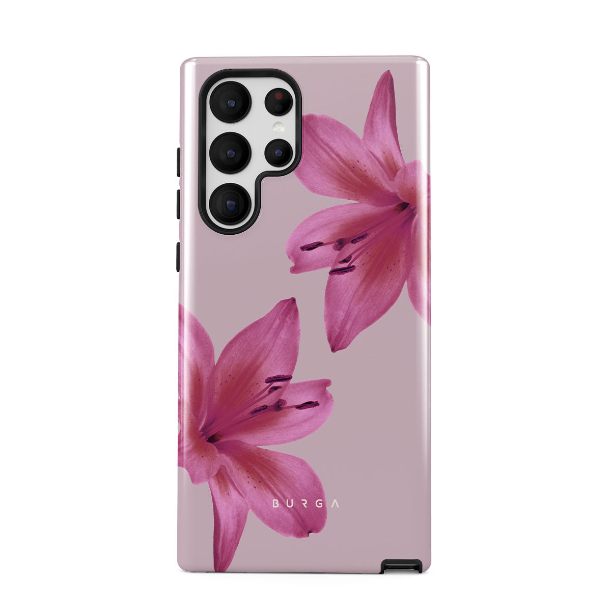 A gentle hush of pink forms where soft lilies sway. Their tender petals — a silent ode to the delicate dance of life. The Fragile Beauty Samsung Galaxy S22 Ultra phone case design invites you to lean into the soft embrace of nature, letting its subtle rhythms guide your journey.
