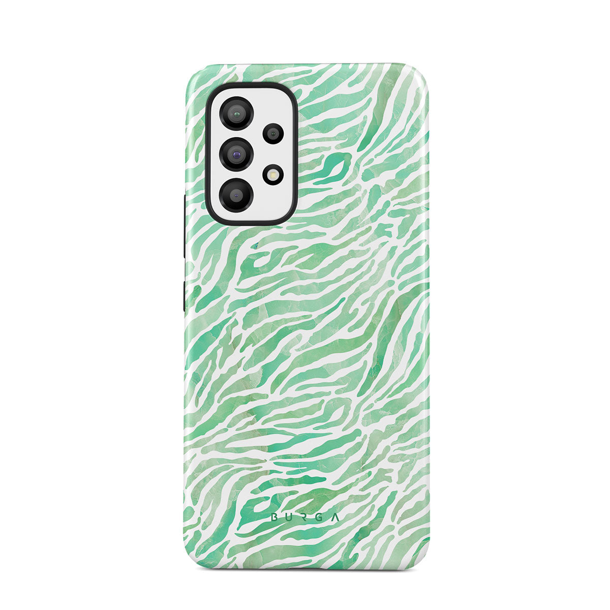 Our Free Spirit Samsung Galaxy A33 phone case features an exotic zebra pattern in varying shades of green. Keep your spirits up, as there is no need to worry about your phone, as this trendy case is not only pretty but offers the heavy-duty protection that your cellphone requires.