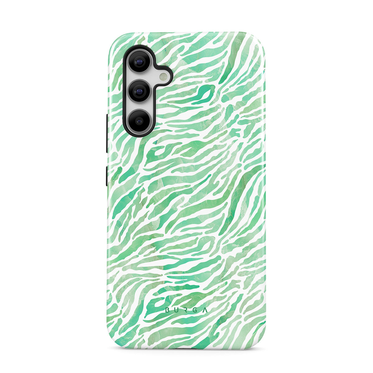 Our Free Spirit Samsung Galaxy A55 phone case features an exotic zebra pattern in varying shades of green. Keep your spirits up, as there is no need to worry about your phone, as this trendy case is not only pretty but offers the heavy-duty protection that your cellphone requires.