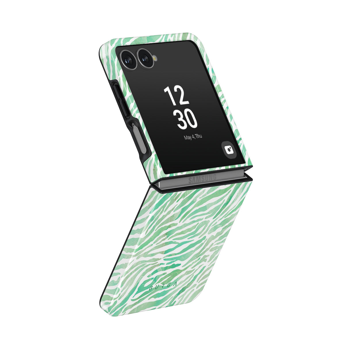 Our Free Spirit Samsung Galaxy Z Flip 7 phone case features an exotic zebra pattern in varying shades of green. Keep your spirits up, as there is no need to worry about your phone, as this trendy case is not only pretty but offers the heavy-duty protection that your cellphone requires.