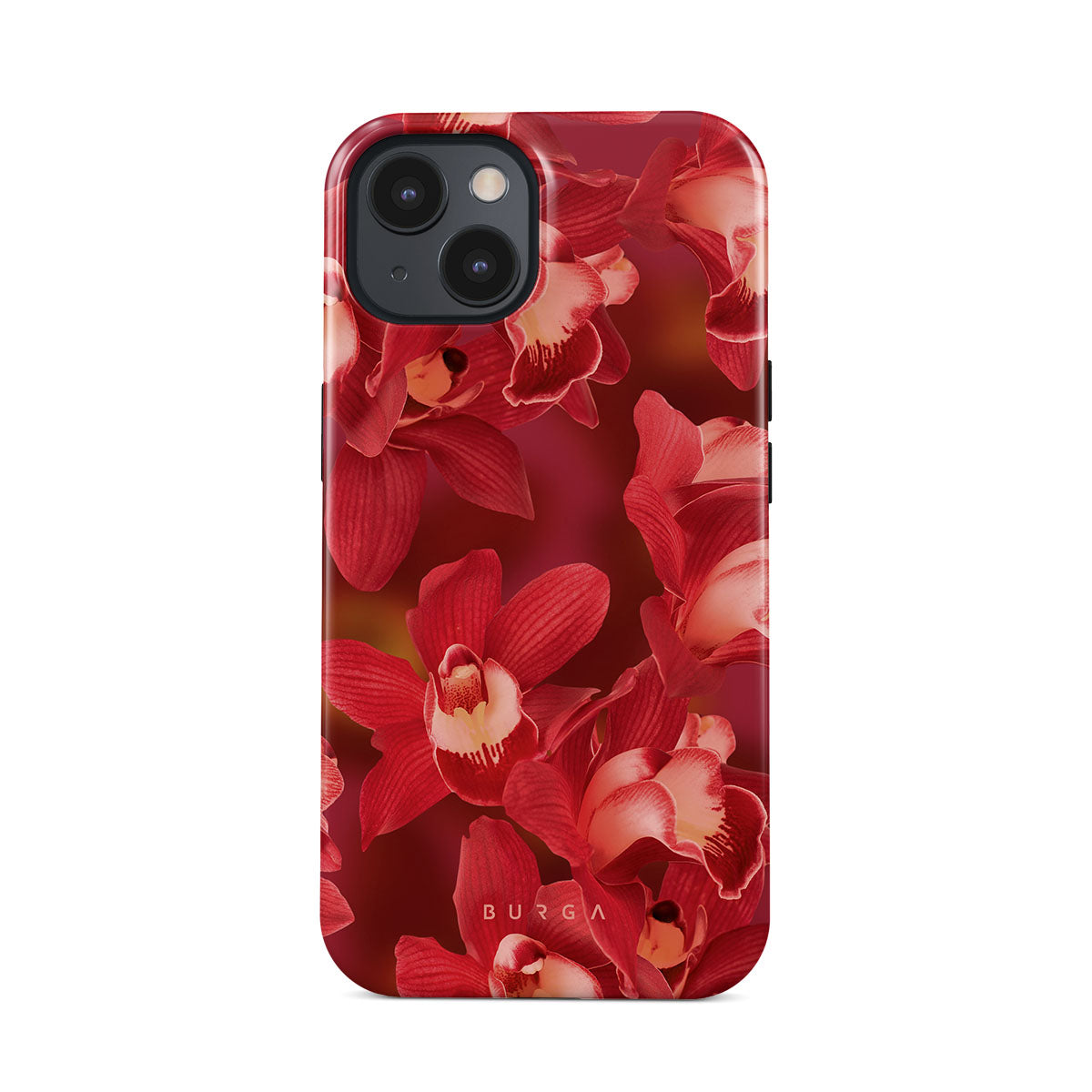 The deep red orchids emerge with a passionate intensity, evoking the fervor and depth of emotions that come with fully experiencing life. They are a vibrant call to embrace every heartbeat, to live deeply and love boldly. Discover the Goddess Energy iPhone 14 phone case design.