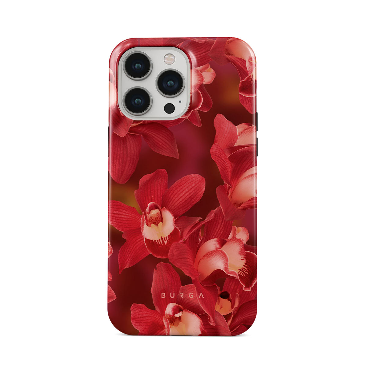 The deep red orchids emerge with a passionate intensity, evoking the fervor and depth of emotions that come with fully experiencing life. They are a vibrant call to embrace every heartbeat, to live deeply and love boldly. Discover the Goddess Energy iPhone 14 Pro phone case design.