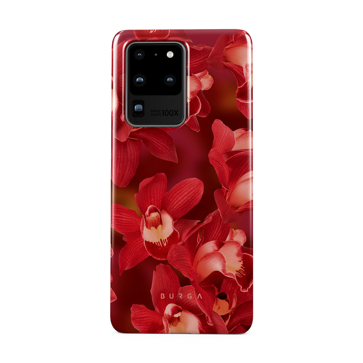 The deep red orchids emerge with a passionate intensity, evoking the fervor and depth of emotions that come with fully experiencing life. They are a vibrant call to embrace every heartbeat, to live deeply and love boldly. Discover the Goddess Energy Samsung Galaxy S20 Ultra 4G / 5G phone case design.