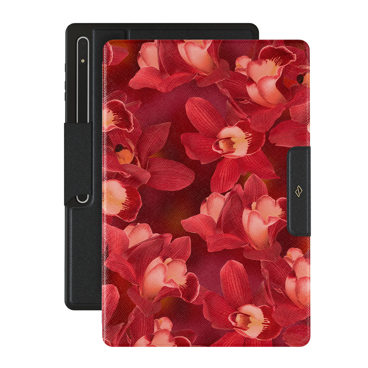 The deep red orchids emerge with a passionate intensity, evoking the fervor and depth of emotions that come with fully experiencing life. They are a vibrant call to embrace every heartbeat, to live deeply and love boldly. Discover the Goddess Energy Samsung Galaxy Tab S8 Ultra folio case design.