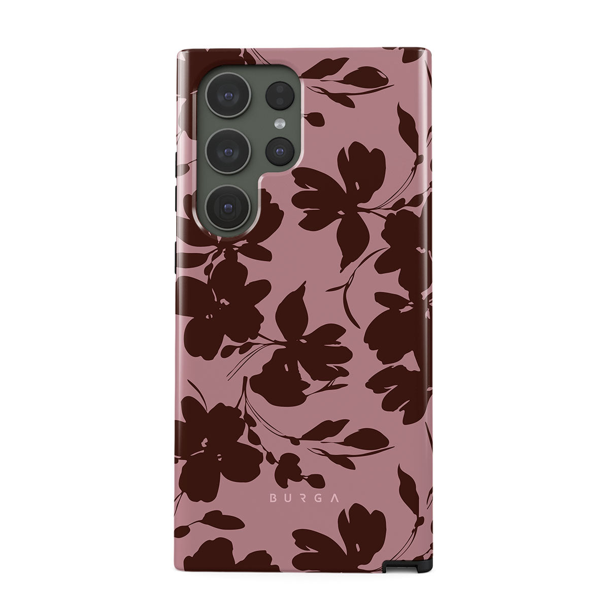 Quietly bold, our Gossip Samsung Galaxy S23 Ultra phone case design speaks volumes in subtlety. A soft rosé background, layered with deep red-brown floral accents, gives off a refined, almost mysterious vibe. It's for those who let the details do the talking.