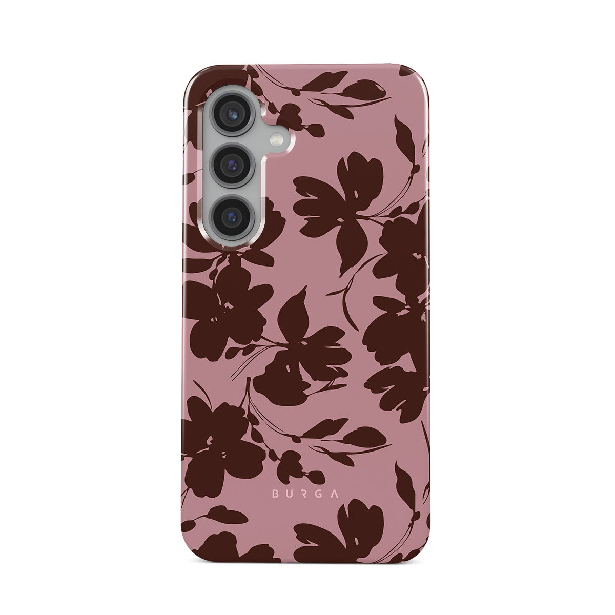 Quietly bold, our Gossip Samsung Galaxy S24 Plus phone case design speaks volumes in subtlety. A soft rosé background, layered with deep red-brown floral accents, gives off a refined, almost mysterious vibe. It's for those who let the details do the talking.