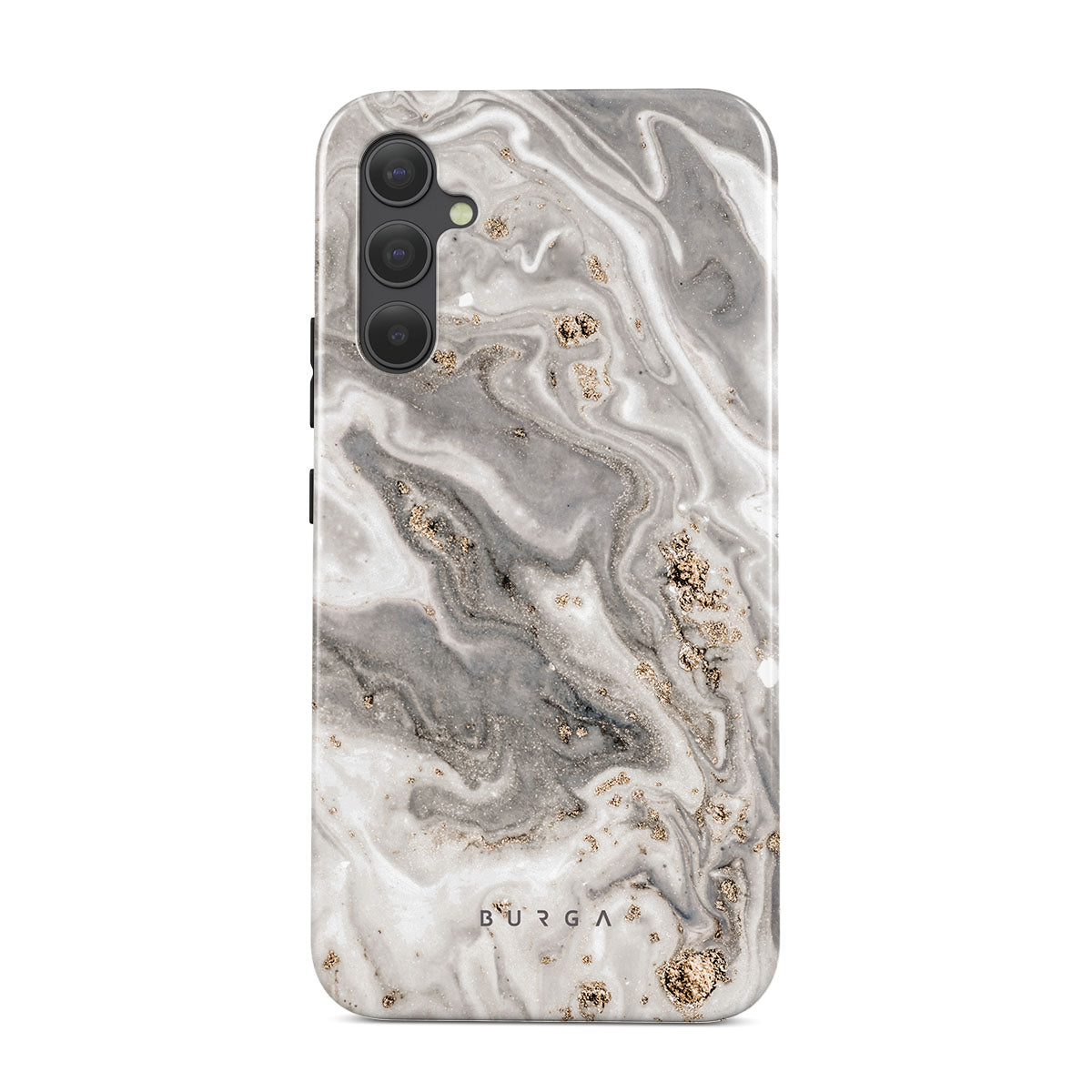 The wind outside is playing his songs. Some fear, some love, and some simply enjoy. But do not be afraid, with our grey marble Samsung Galaxy A34 phone case inspired by a beautiful snowstorm, you can have the pretty part of it without any coldness. And as the case offers heavy-duty protection, your phone will also be safe and sound!