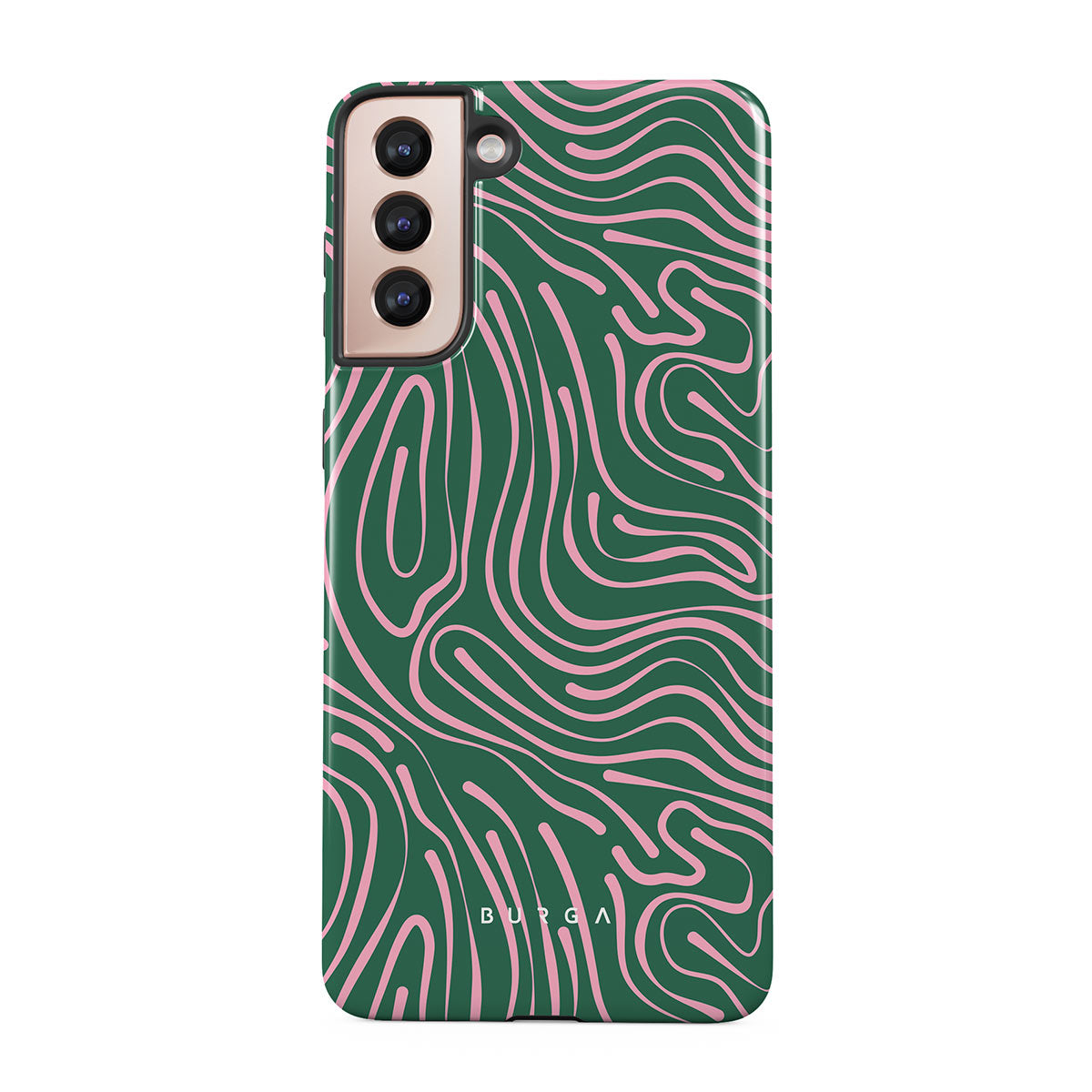 Fresh and mesmerizing, our Hawaiian Breeze Samsung Galaxy S21 Plus phone case design combines a pastel pink wavy pattern with a crisp green background creating a refreshing look. The abstract pattern will indeed become a star in your accessorizing game, while the phone case will keep your device protected at all times!