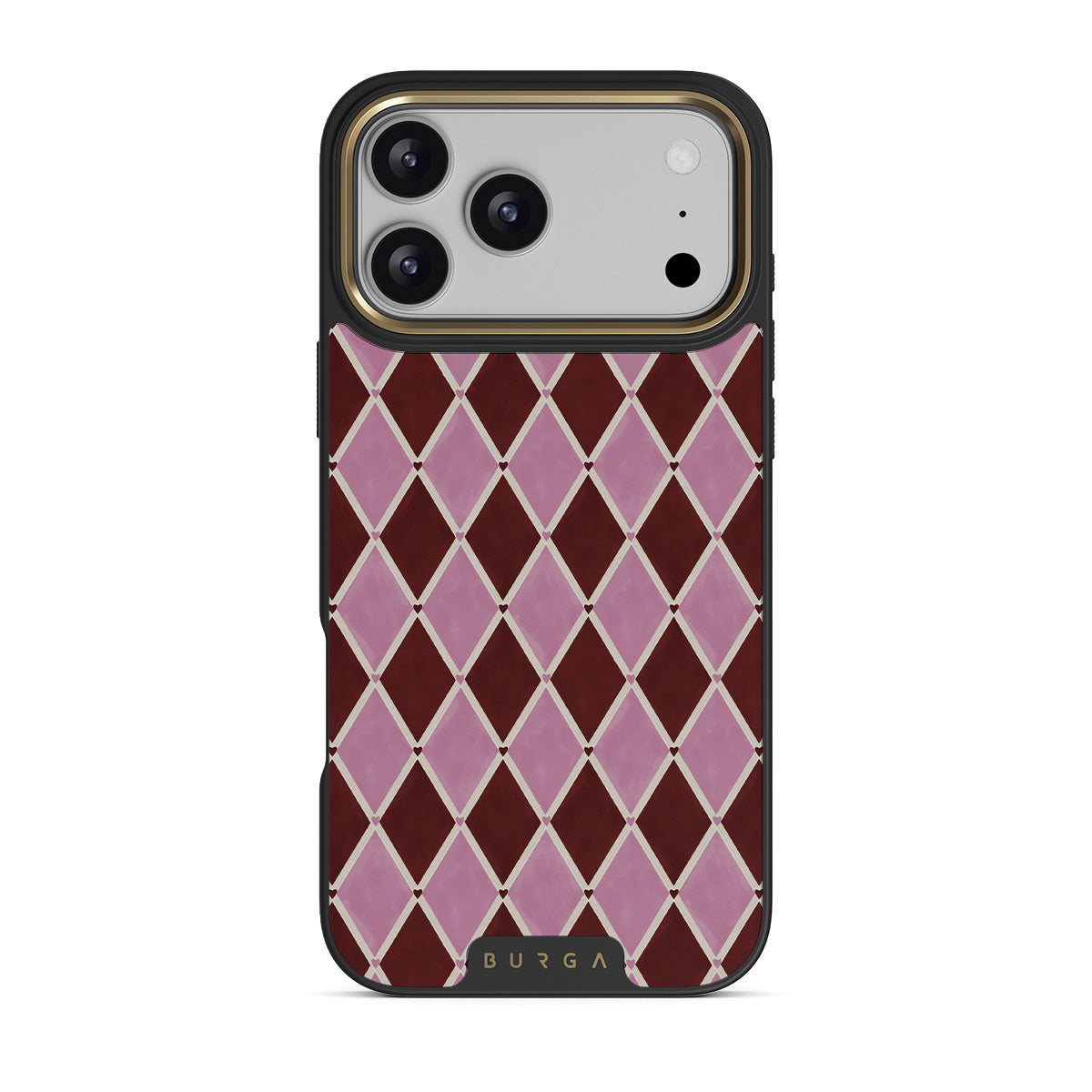This design features: harlequin pattern, pink diamonds, deep red background
