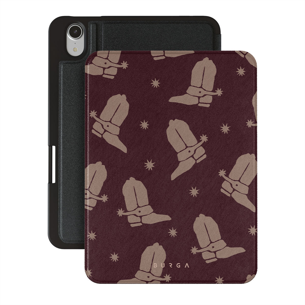 Say Howdy to this charming iPad Mini 8.3 (A17 Pro/6th Gen) 2021 folio case design. Cowboy boots and stars dance across a deep brown background, celebrating the essence of western life. Perfect for those who embrace their free spirit.