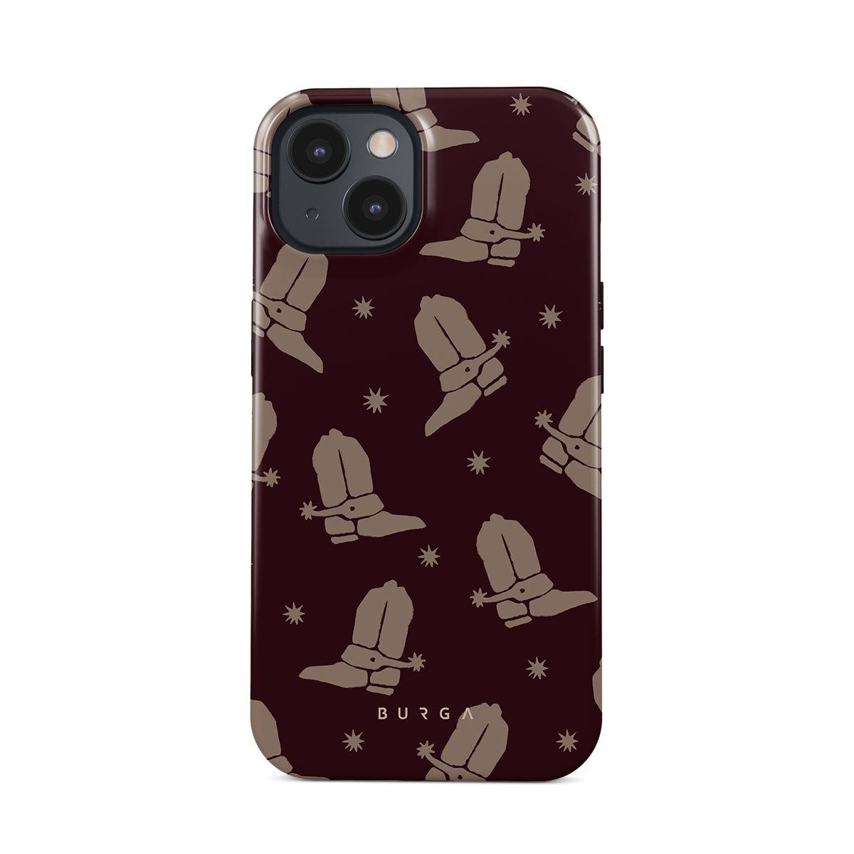 Say Howdy to this charming iPhone 13 phone case design. Cowboy boots and stars dance across a deep brown background, celebrating the essence of western life. Perfect for those who embrace their free spirit.