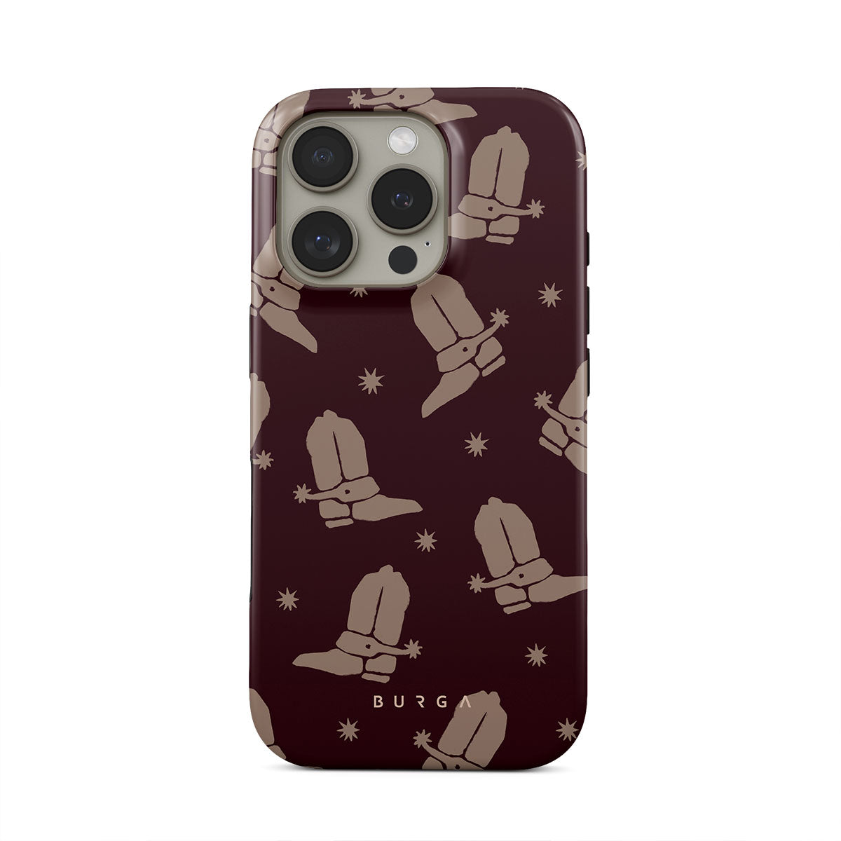 Say Howdy to this charming iPhone 16 Pro Max phone case design. Cowboy boots and stars dance across a deep brown background, celebrating the essence of western life. Perfect for those who embrace their free spirit.