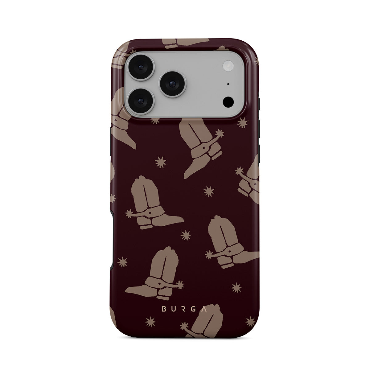 Say Howdy to this charming iPhone 17 Pro Max phone case design. Cowboy boots and stars dance across a deep brown background, celebrating the essence of western life. Perfect for those who embrace their free spirit.