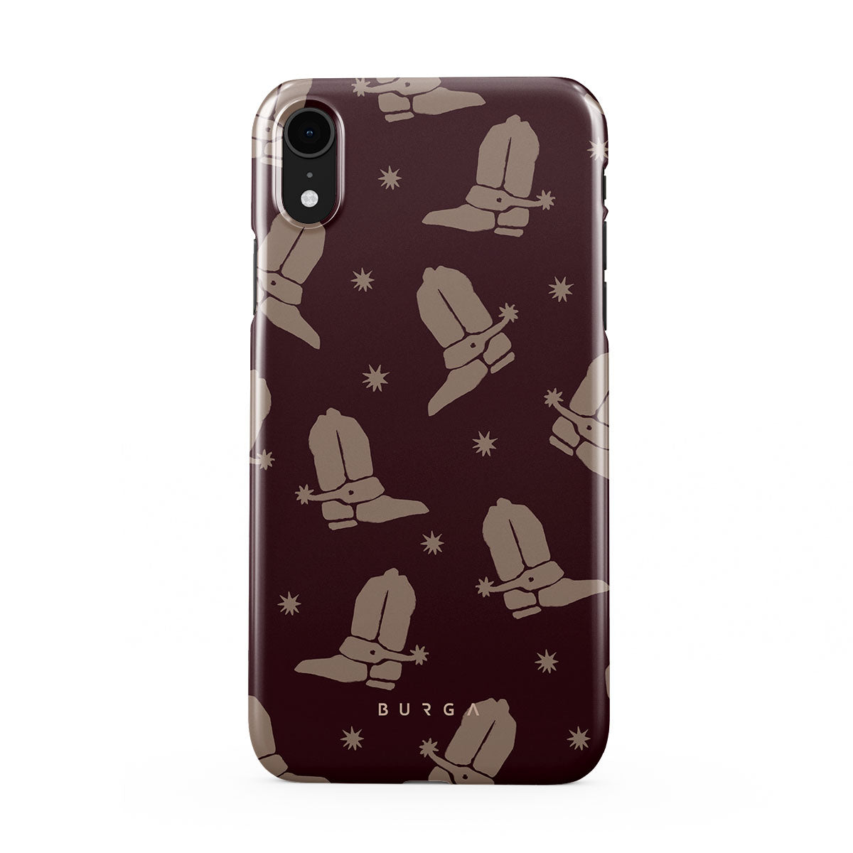 Say Howdy to this charming iPhone XR phone case design. Cowboy boots and stars dance across a deep brown background, celebrating the essence of western life. Perfect for those who embrace their free spirit.