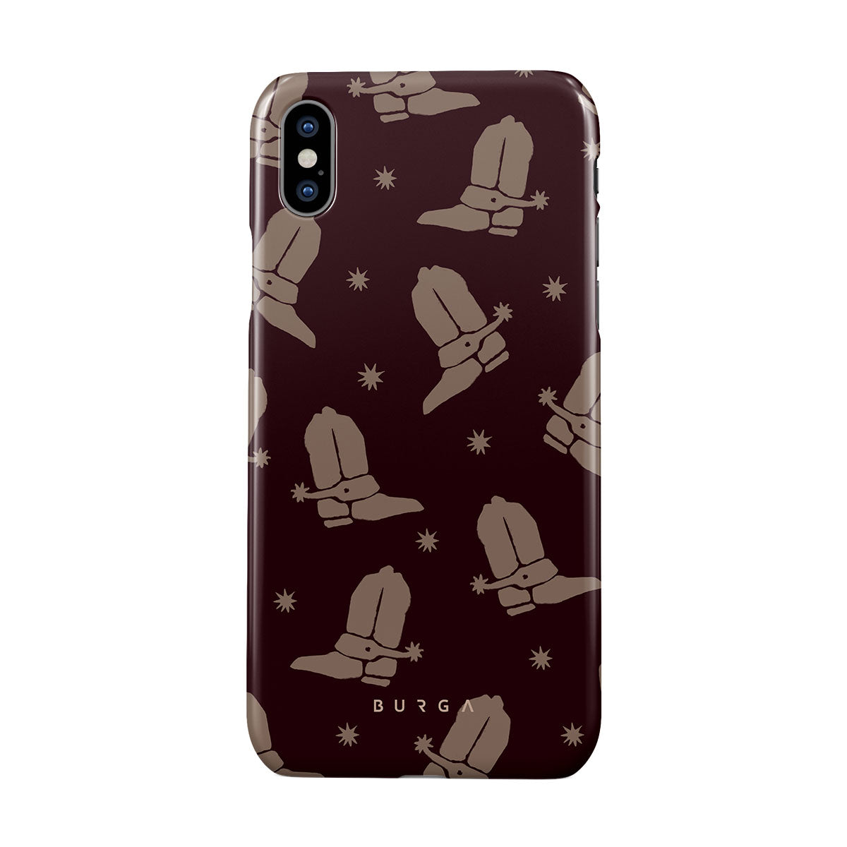 Say Howdy to this charming iPhone XS Max phone case design. Cowboy boots and stars dance across a deep brown background, celebrating the essence of western life. Perfect for those who embrace their free spirit.
