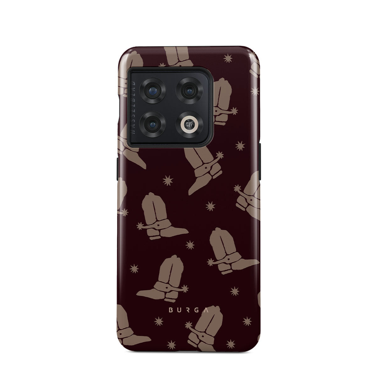 Say Howdy to this charming OnePlus 10 Pro 5G phone case design. Cowboy boots and stars dance across a deep brown background, celebrating the essence of western life. Perfect for those who embrace their free spirit.
