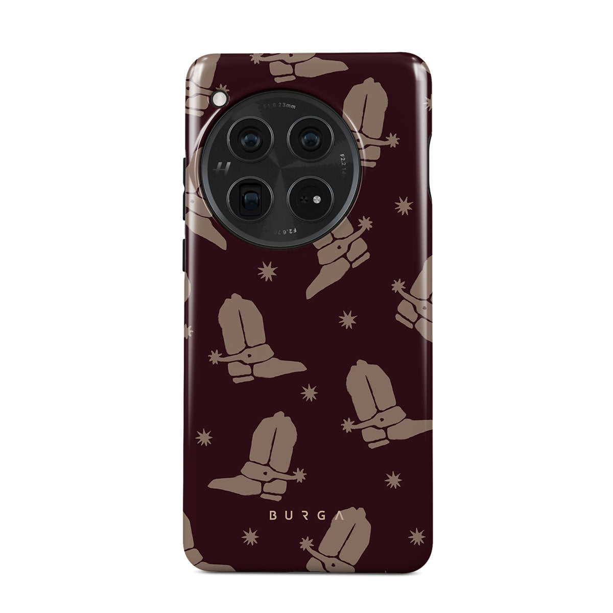 Say Howdy to this charming OnePlus 12 phone case design. Cowboy boots and stars dance across a deep brown background, celebrating the essence of western life. Perfect for those who embrace their free spirit.