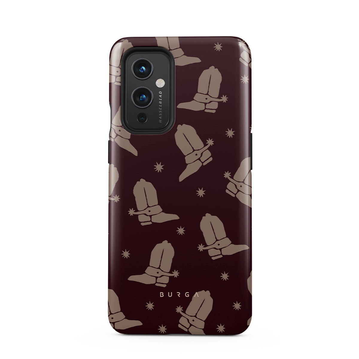 Say Howdy to this charming OnePlus 9 phone case design. Cowboy boots and stars dance across a deep brown background, celebrating the essence of western life. Perfect for those who embrace their free spirit.